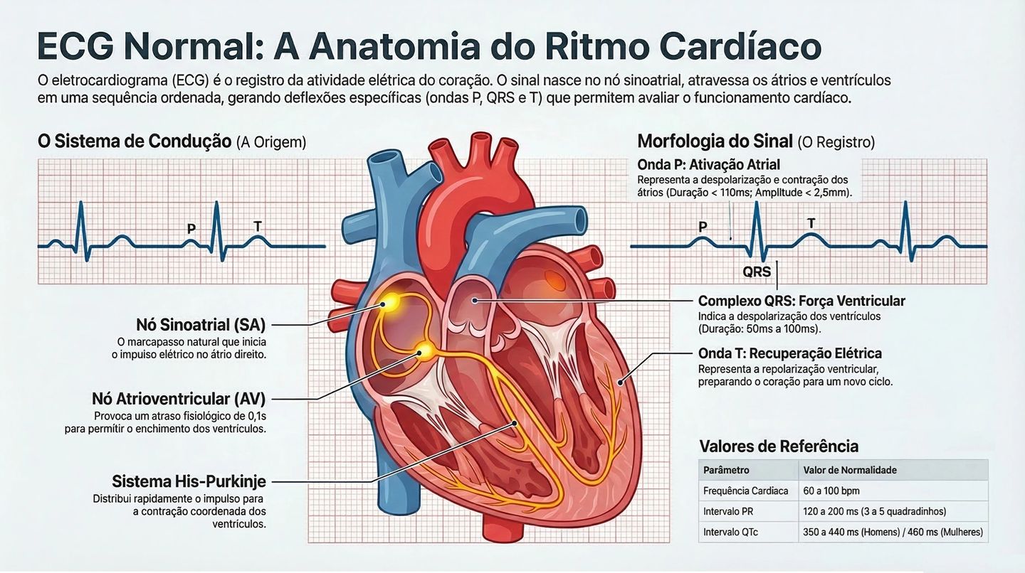 Reconhecer um eletrocardiograma normal é a base fundamental para qualquer profissional de saúde que interpreta ECGs. Antes de identificar anormalidades, é essencial dominar os critérios de normalidade. Este guia completo apresenta todos os parâmetros necessários para confirmar um ECG dentro dos limites normais.